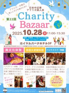 日本中近東アフリカ婦人会によるチャリティーバザー 2025-10-28 公開済み: 2025年10月30日更新: 2025年10月30日作成者: AFRECOカテゴリー: お知らせ 日本中近東アフリカ婦人会による第22回チャリティバザーに伺いました。大賑わいで大晦日の明治神宮のようでした。 関連記事 24 カメルーンのCRTV国営テレビからの取材 2024-5-24 カメルーンのCRTV国営テレビの取材を受けました。日本とカメルーンのこれまでの協力案件と今後の展望をお話ししました。 公開済み: 2025年10月30日更新: 2025年10月30日作成者: AFRECOカテゴリー: お知らせ 27 ガボン共和国情勢説明会開催 2023-10-25 野口大使閣下をお招きしてガボン共和国の情勢説明会を開催しました。 公開済み: 2025年10月30日更新: 2025年10月30日作成者: AFRECOカテゴリー: お知らせ 30 モザンビーク外務大臣と懇談 2023-11-28 モザンビークのマカモ外務大臣閣下一行を、モライス大使閣下とお迎えしました。 大使閣下はもうすぐ離任。お世話になりました。 公開済み: 2025年10月30日更新: 2025年10月30日作成者: AFRECOカテゴリー: お知らせ