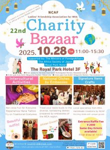 The 22nd Charity Bazaar hosted by NCAF 2025-10-28 公開済み: 2025年10月30日更新: 2025年10月30日作成者: AFRECOカテゴリー: Information We attended the 22nd Charity Bazaar hosted by the Ladies’ Friendship Association for MEA. It was incredibly crowded, like Meiji Shrine on New Year’s Eve. 関連記事 26 Discussion with Zambia’s Minister of Finance and National Planning 2024-08-24 Discussions with Zambia’s Minister of Finance and National Planning at the TICAD 9 Ministerial Meeting. […] 公開済み: 2025年10月30日更新: 2025年10月30日作成者: AFRECOカテゴリー: Information 23 Report on business trip to Djibouti to former Ambassador 2025-01-23 We reported to former Djibouti Ambassador Otsuka about our business trip to Djibouti. 公開済み: 2025年10月30日更新: 2025年10月30日作成者: AFRECOカテゴリー: Information 01 Discussion with the Ambassador of the Republic of Congo 2024-03-01 We exchanged views with Benjamin EVAYOULOU, Ambassador of the Republic of Congo. 公開済み: 2025年10月30日更新: 2025年10月30日作成者: AFRECOカテゴリー: Information